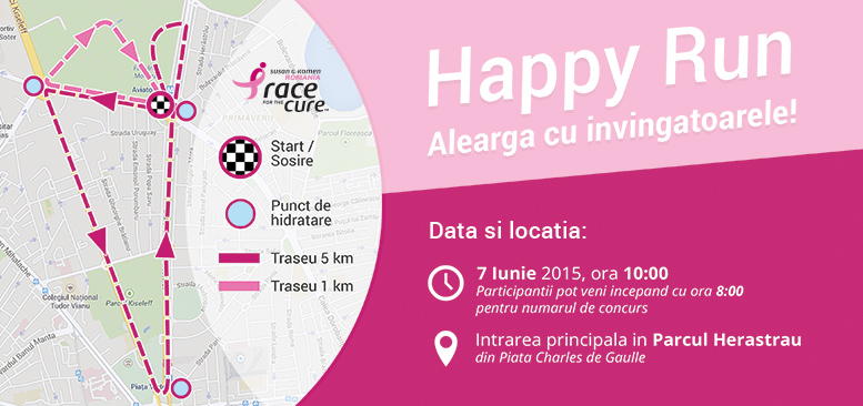 Cursa Happy Run – Race For The Cure este inițiată de fundația Susan G. Komen în Statele Unite, creată de Fundația Renașterea București, și are ca are ca obiectiv strângerea de fonduri pentru prevenirea și combaterea cancerului de sân. Sărbătorim și aducem speranța!