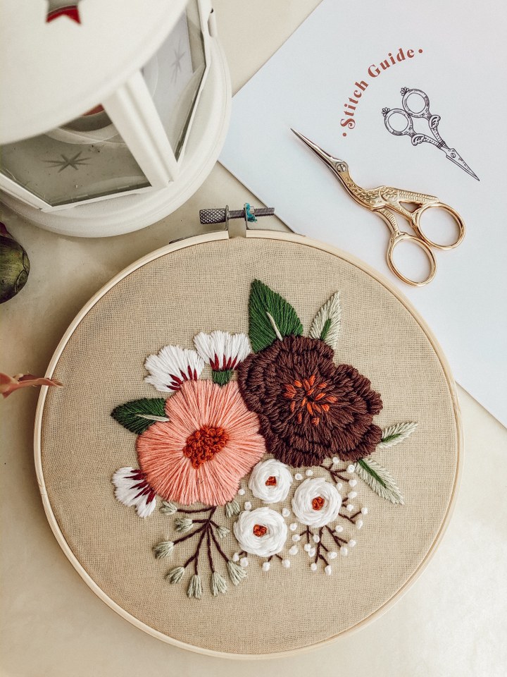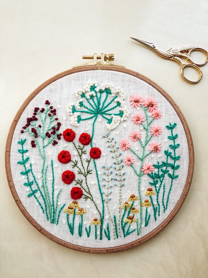 - Gherghef: Ține materialul întins pentru o cusătură corectă și previne și eventuale împunsături cu acul. Este format din două cercuri, care se suprapun, apoi se fixează prin strângerea unui șurub. Eu am ales 4 dimensiuni diferite pentru început, între 14 cm și 20 cm, din lemn, însă vin în multe dimensiuni și tipuri de materiale. Pentru display-ul broderiei, materialul va rămâne pe gherghef odată finalizată broderia. Se va lăsa în jur de 10 cm de material de jur împrejur, care va fi cusut astfel încât să se păstreze plăcut forma gherghefului.